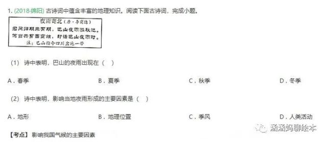 地理学科中,像《夜雨寄北》这首诗,让学生根据诗句判断这首诗写的是哪个季节,形成夜雨的主要因素是什么。